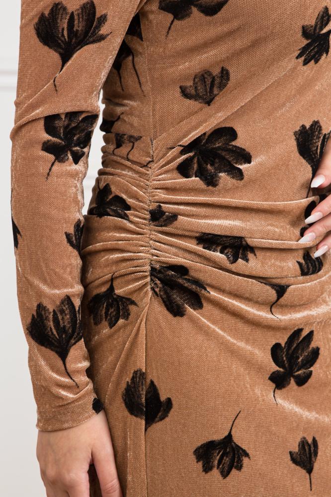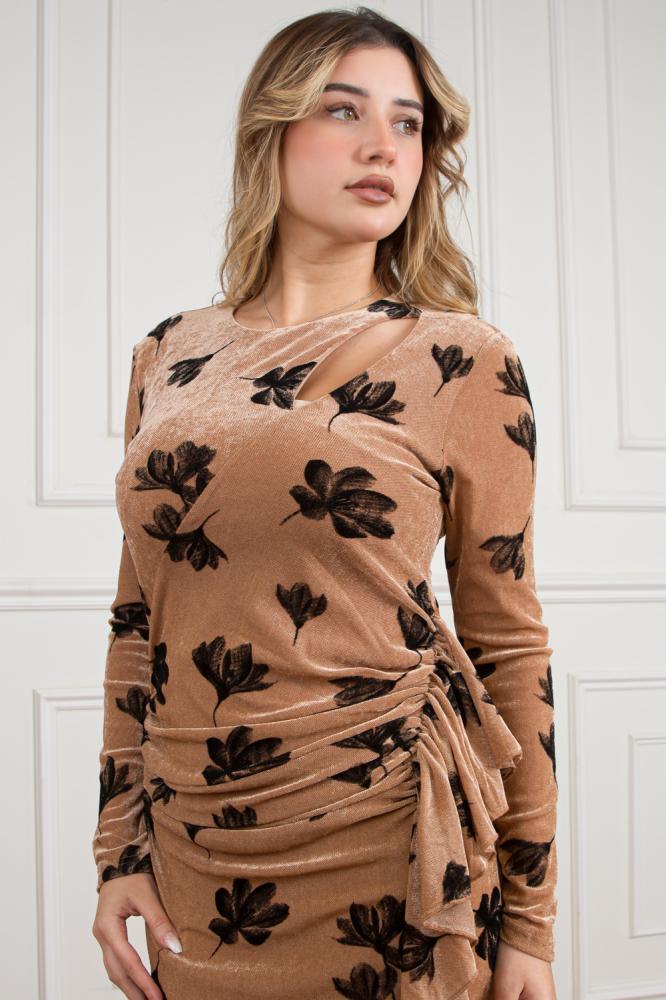 فستان همسة مخمل يجسد الرفاهية في أبسط تفاصيلها. تصميم ناعم من قماش مخملي بنقشة زهرية سوداء تمنح لمسة فنية راقية، مع قصة منسدلة تبرز أنوثتك بانسيابية ساحرة. الكشكشة الجانبية تضيف حركة أنيقة للقصّة، بينما الفتحة العصرية عند الكتف تمنحه جرأة راقية دون مبالغة.