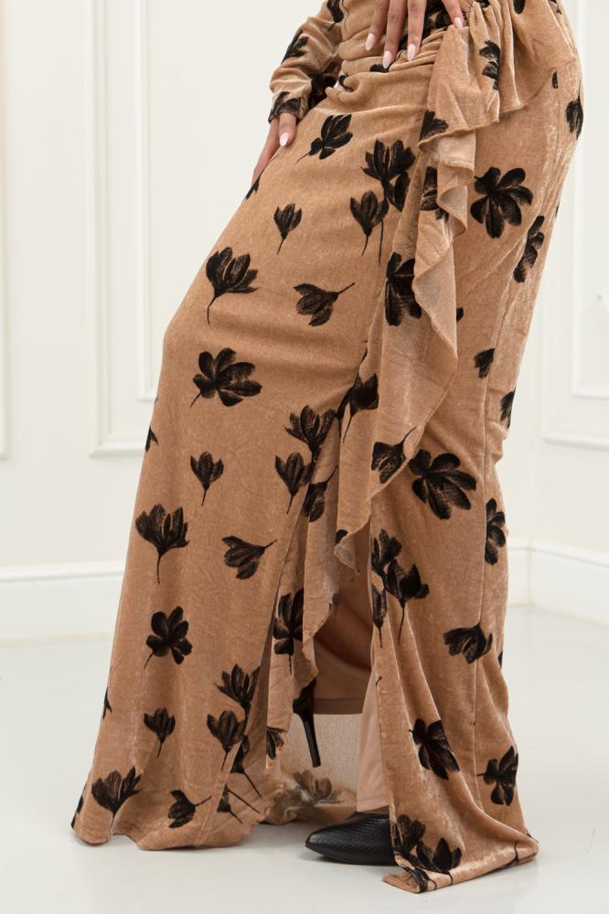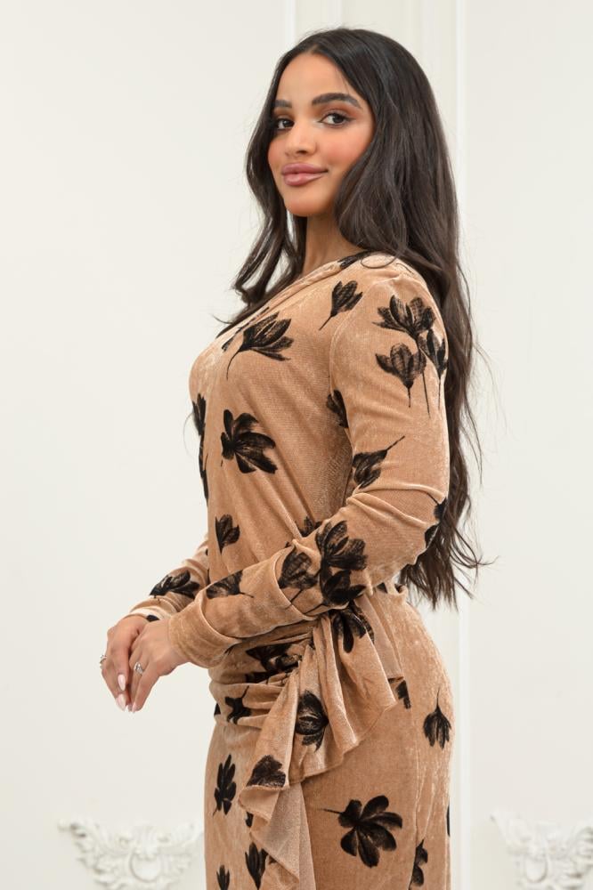 فستان همسة مخمل يجسد الرفاهية في أبسط تفاصيلها. تصميم ناعم من قماش مخملي بنقشة زهرية سوداء تمنح لمسة فنية راقية، مع قصة منسدلة تبرز أنوثتك بانسيابية ساحرة. الكشكشة الجانبية تضيف حركة أنيقة للقصّة، بينما الفتحة العصرية عند الكتف تمنحه جرأة راقية دون مبالغة.