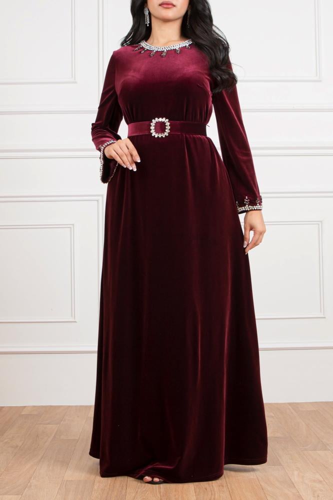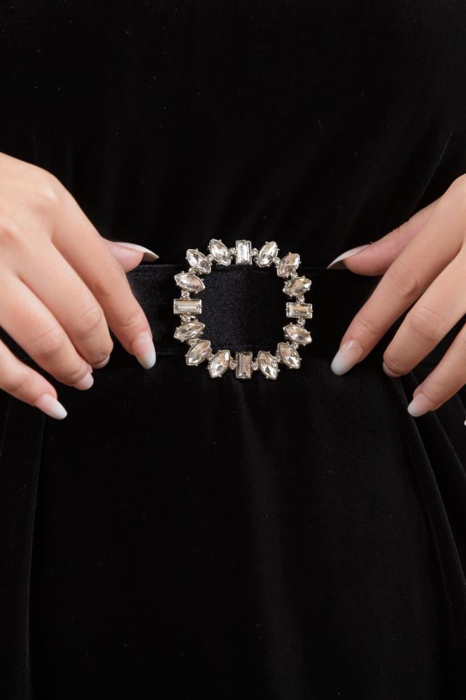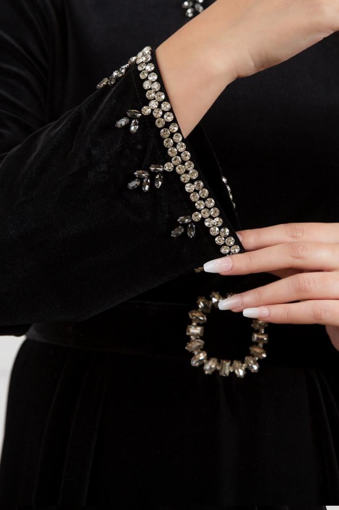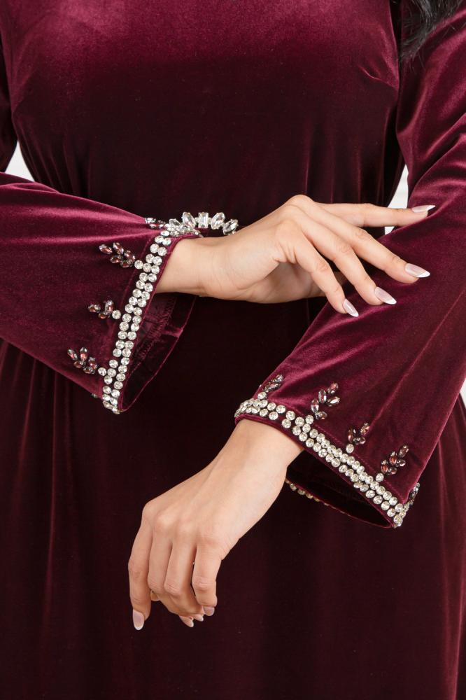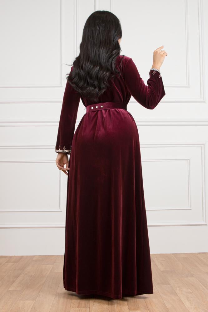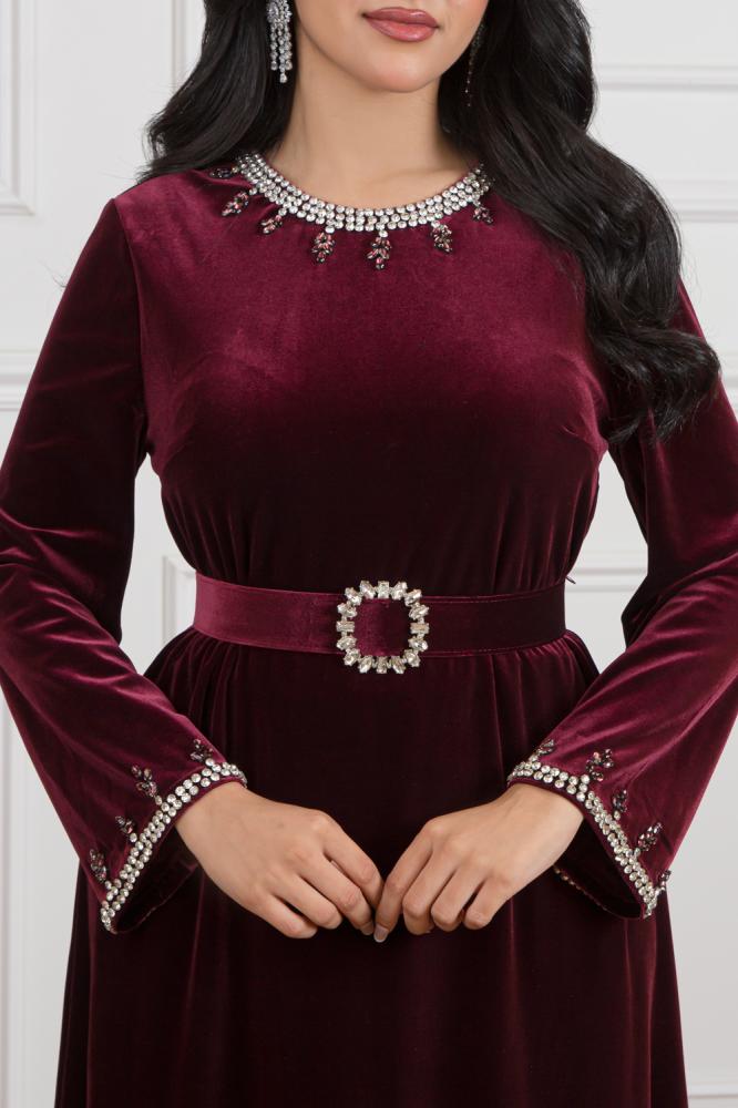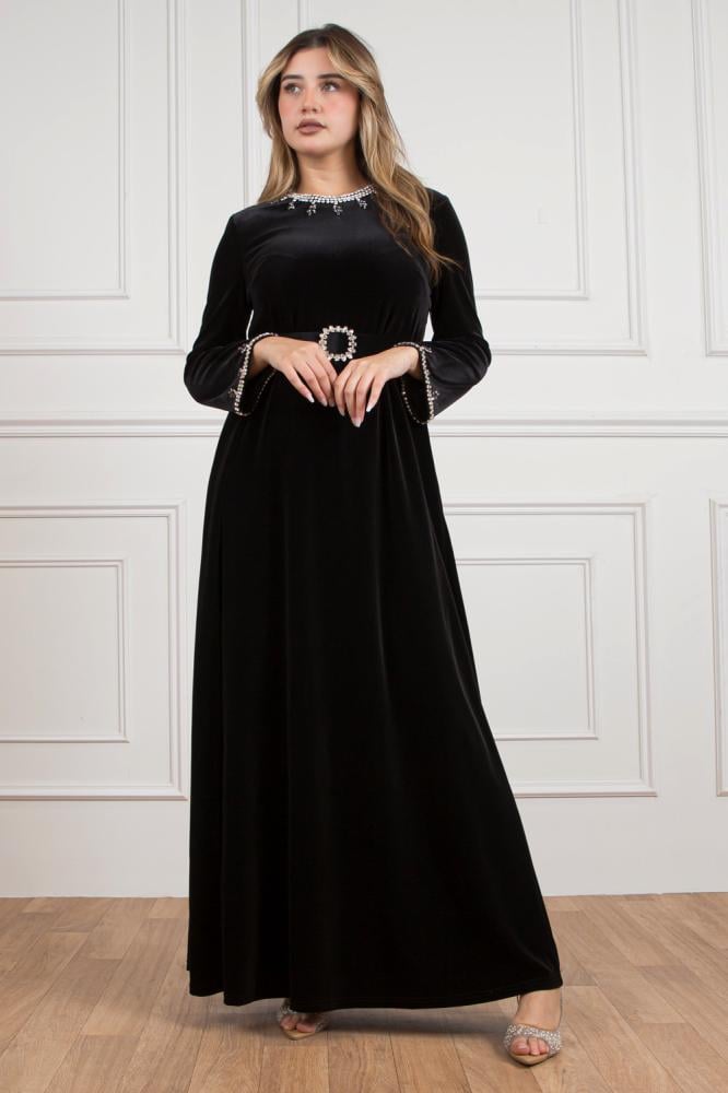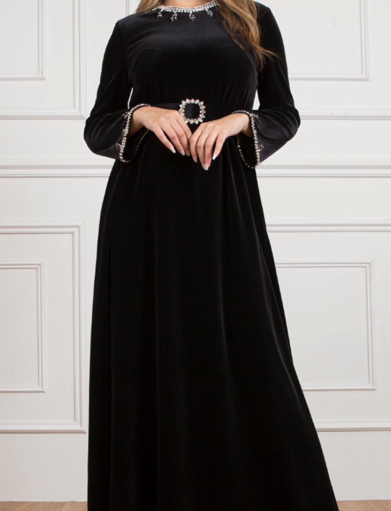 ✨ فستان مخملي فاخر بلونين ساحرين (أسود وبورغندي)، يتميز بياقة مرصّعة بالكريستال اللامع تضيف لمسة من الرقي، مع حزام مخملي مزين بإبزيم من الأحجار الفاخرة يبرز الخصر بأنوثة وأناقة. الأكمام الواسعة بتطريز لؤلؤي تضفي لمسة ملكية تجعل الإطلالة متكاملة في كل مناسبة راقية. 💃🏻