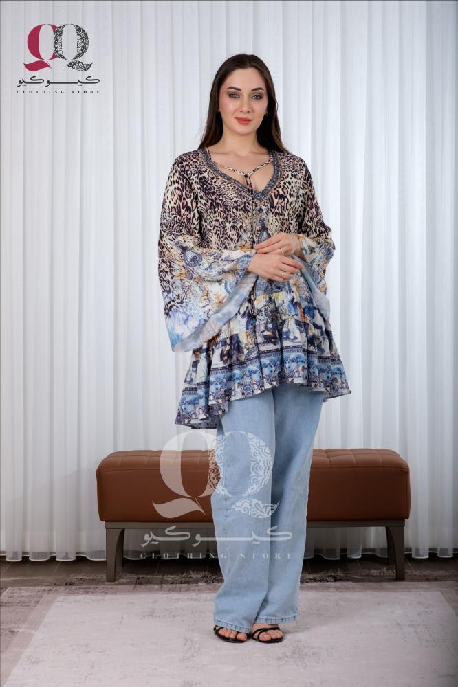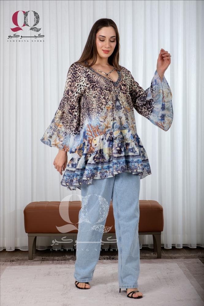 تألقي بإطلالة مميزة مع هذه البلوزة ذات التصميم البوهيمي الجذاب! البلوزة مزينة بنقشة مستوحاة من عالم الطبيعة بتداخل رائع بين نقوش الفهد والزهور لمظهر فريد وأنيق. تتميز بأكمام واسعة تضفي لمسة من الرقي والراحة، بالإضافة إلى ربطة أنيقة عند الصدر لتعزيز جمال التصميم.