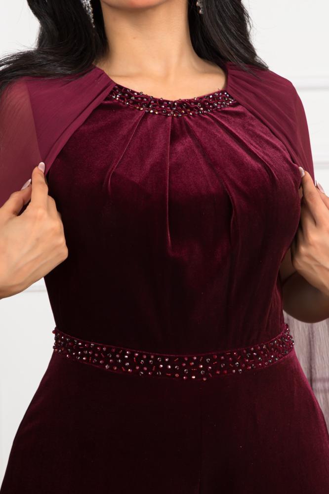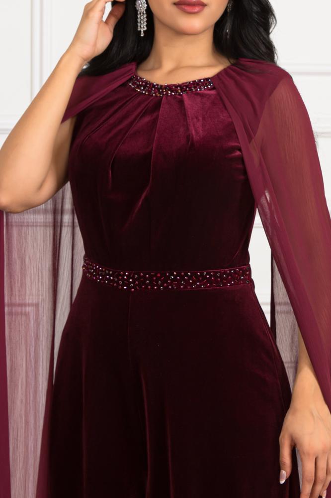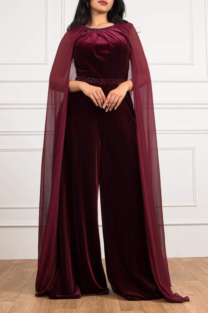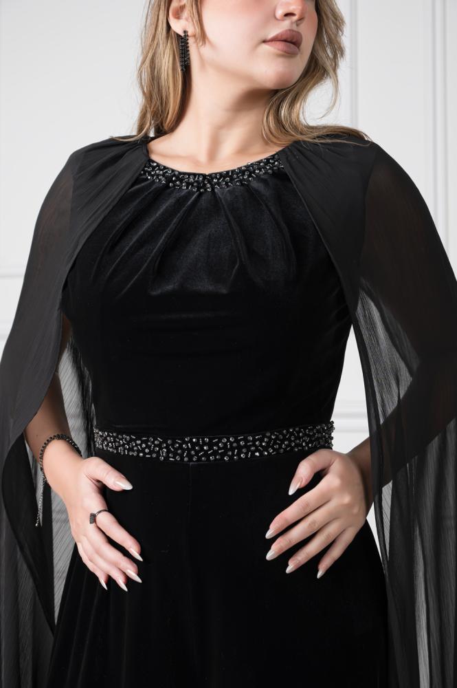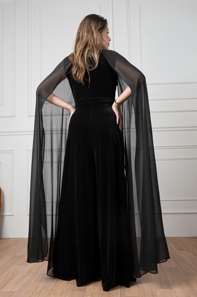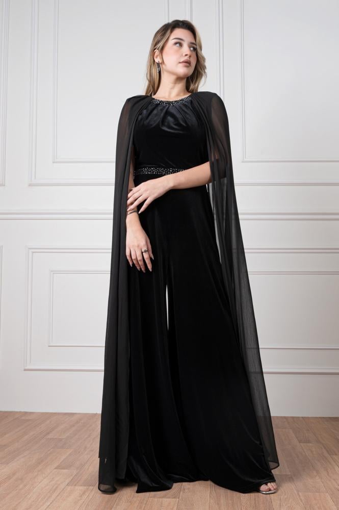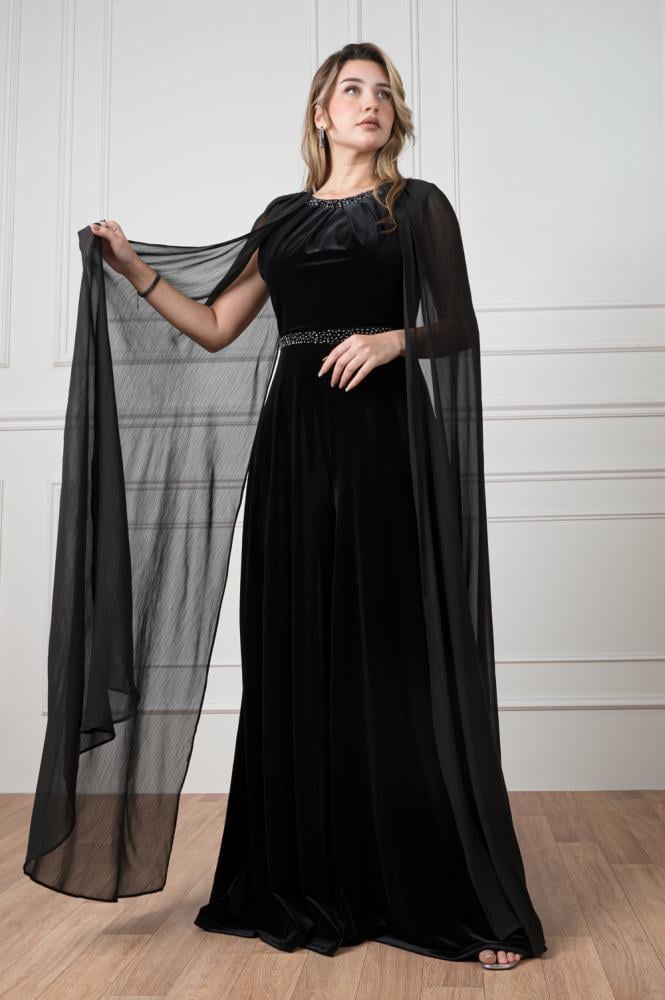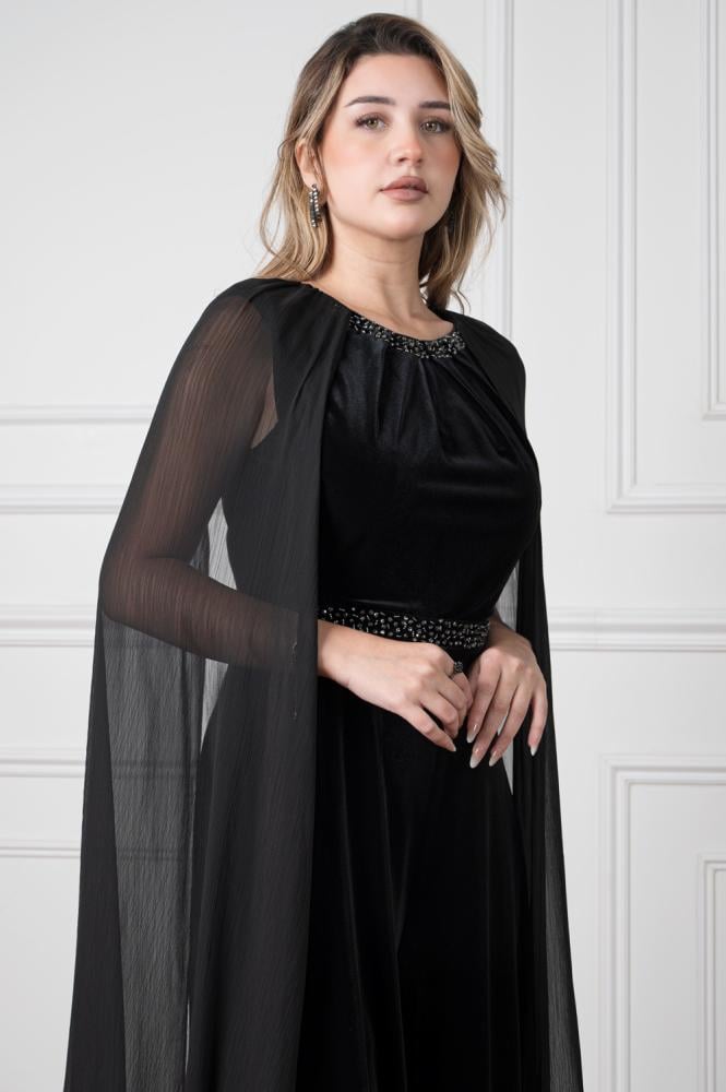 فستان هالة المساء بتصميم فاخر من المخمل والشيفون، يتميز بكاب انسيابي يمنح إطلالة ملكية آسرة. مزين بتطريز لامع على الرقبة والخصر ليعكس فخامة التفاصيل وأناقة السهرات الراقية. الخيار المثالي لإطلالة تفيض ثقة وجاذبية. ✨