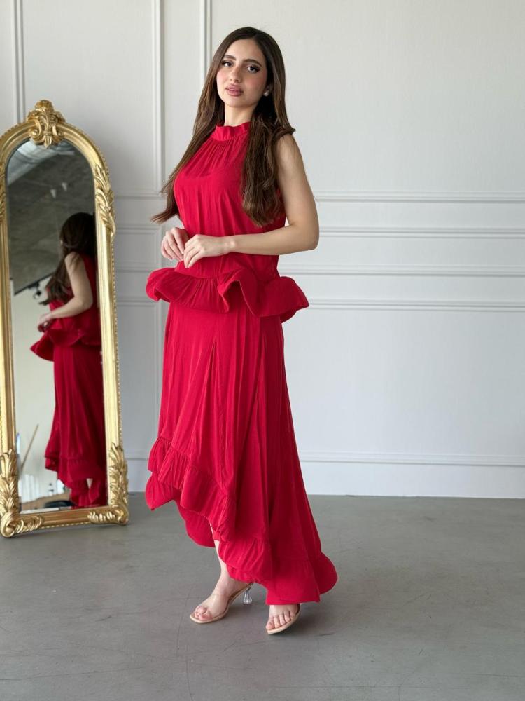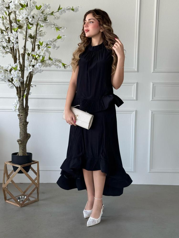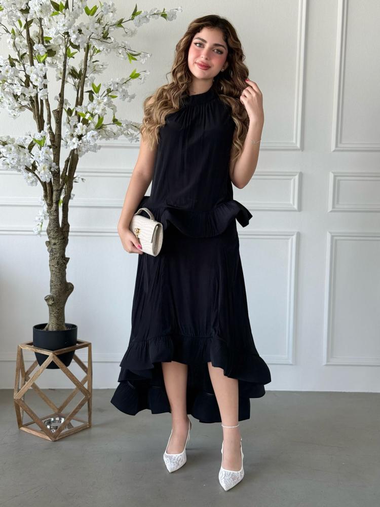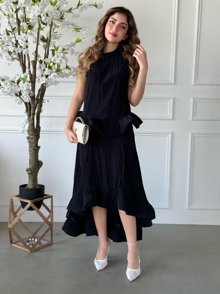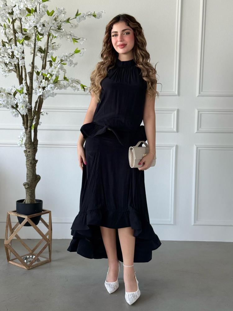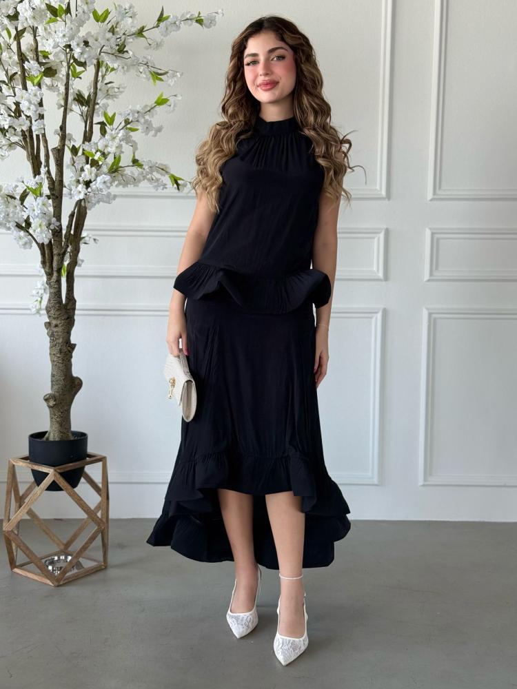 يتكوّن هذا الطقم من بلوزة ناعمة بدون أكمام بلمسة انسيابية، مع تنورة بطول متوسط وتصميم متدرج من الأسفل مع كشكش أنثوي يضفي حركة حالمة على خطواتك.