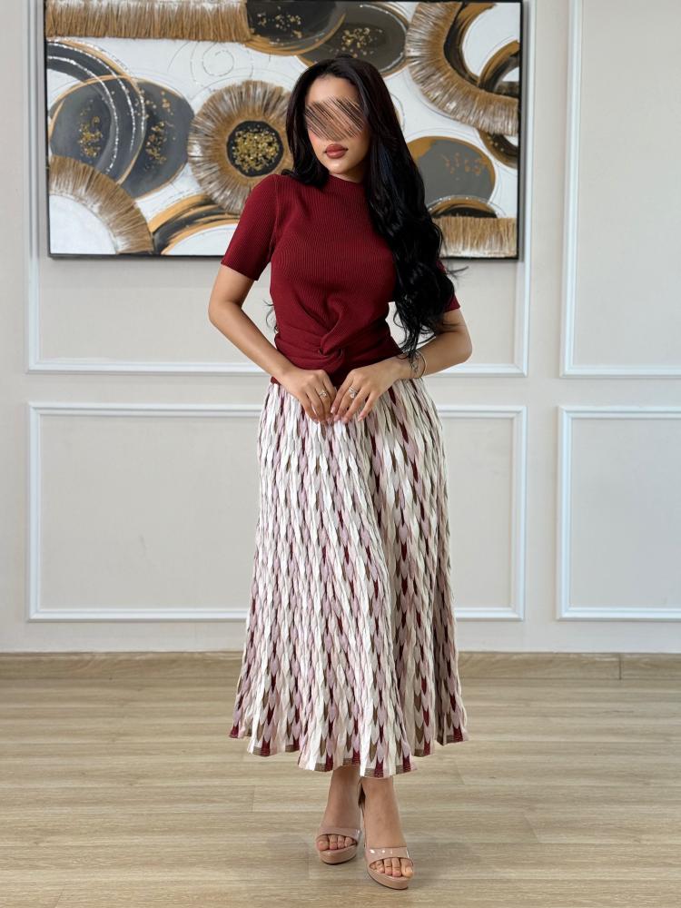 طقم بنغمة خمرية راقية بتصميم يجمع بين البساطة والفخامة. التوب بخامة مطاطية مريحة بتفصيلة ملتفة تبرز الخصر وتمنح مظهرًا أنثويًا متوازنًا، فيما تضيف التنورة المكسّرة المضلّعة حركة ناعمة وانسيابية مع كل خطوة. اختيار مثالي لإطلالة خريفية راقية تنبض بالدفء والأنوثة