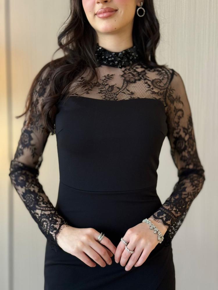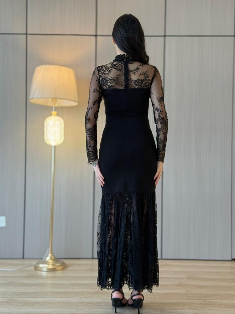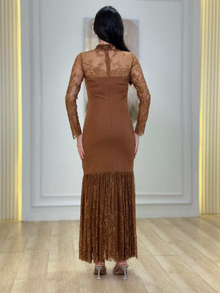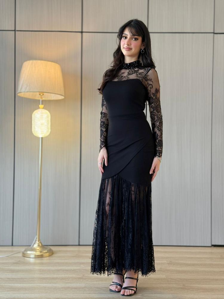 الفستان اللي يخليك أيقونة بكل سهرة ✨.. الدانتيل الشفاف مع القصة النازلة يعطيك حضور ساحر يخطف العيون سواء بالأسود الغامض أو البني الدافئ