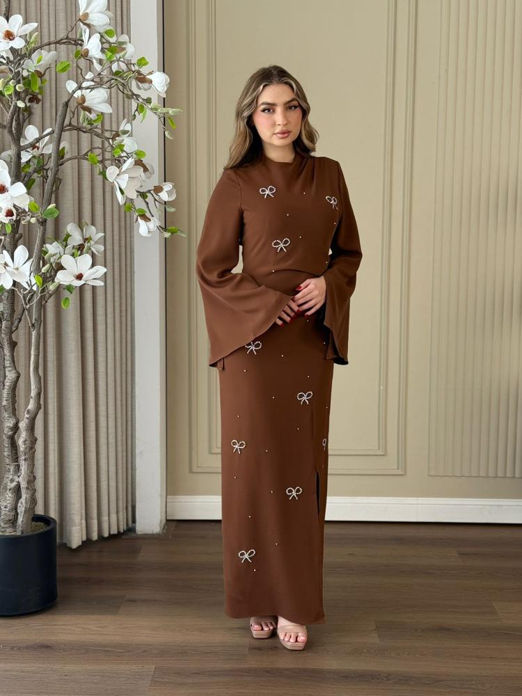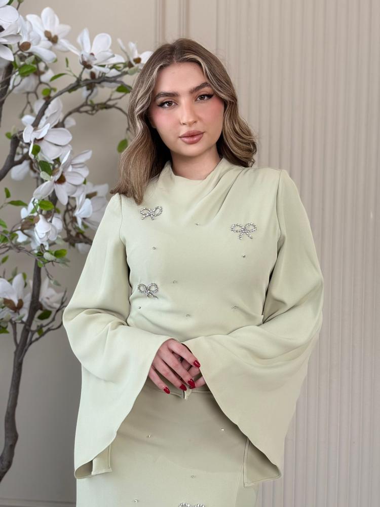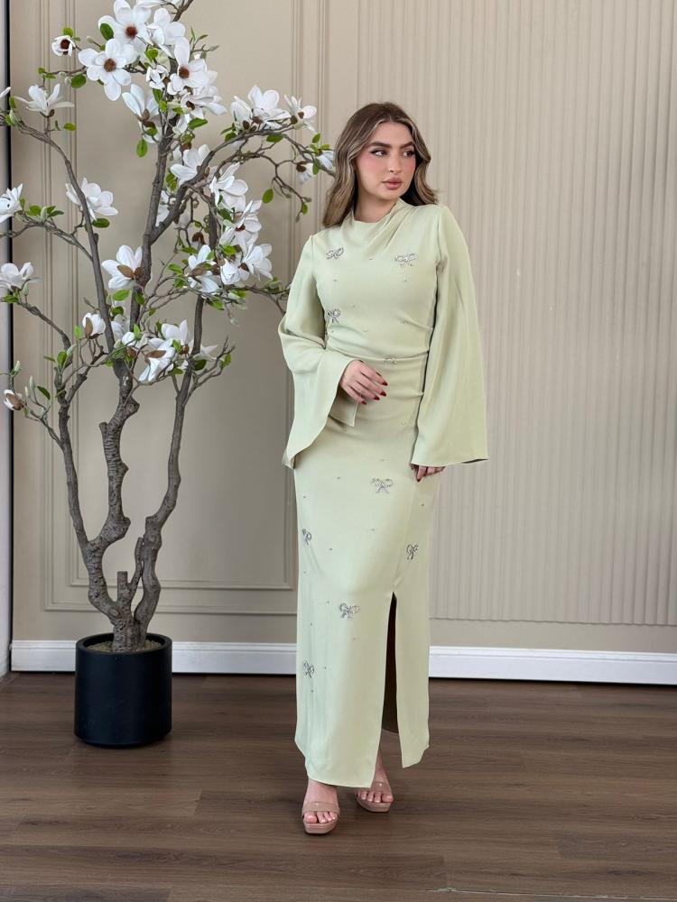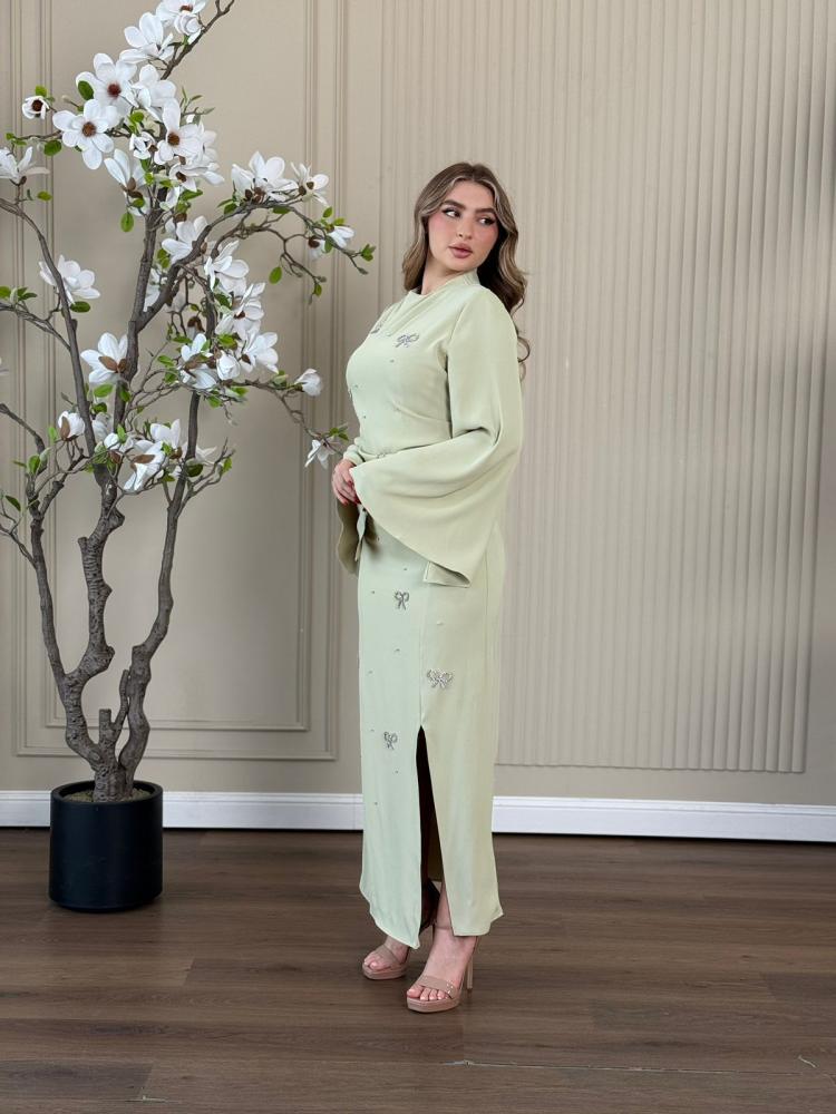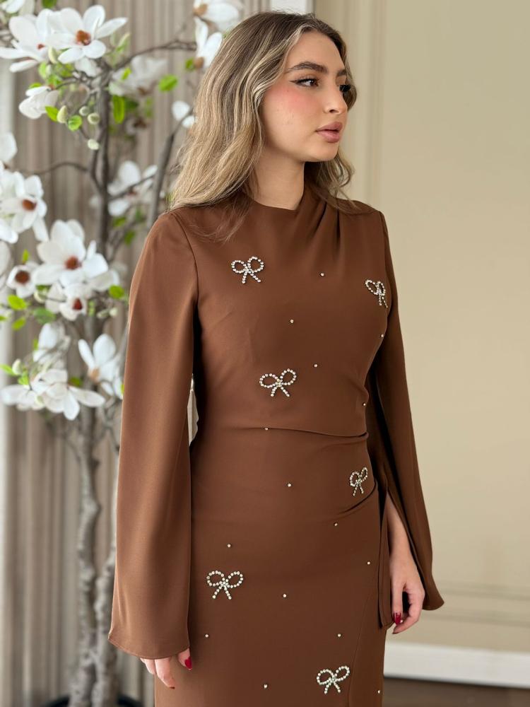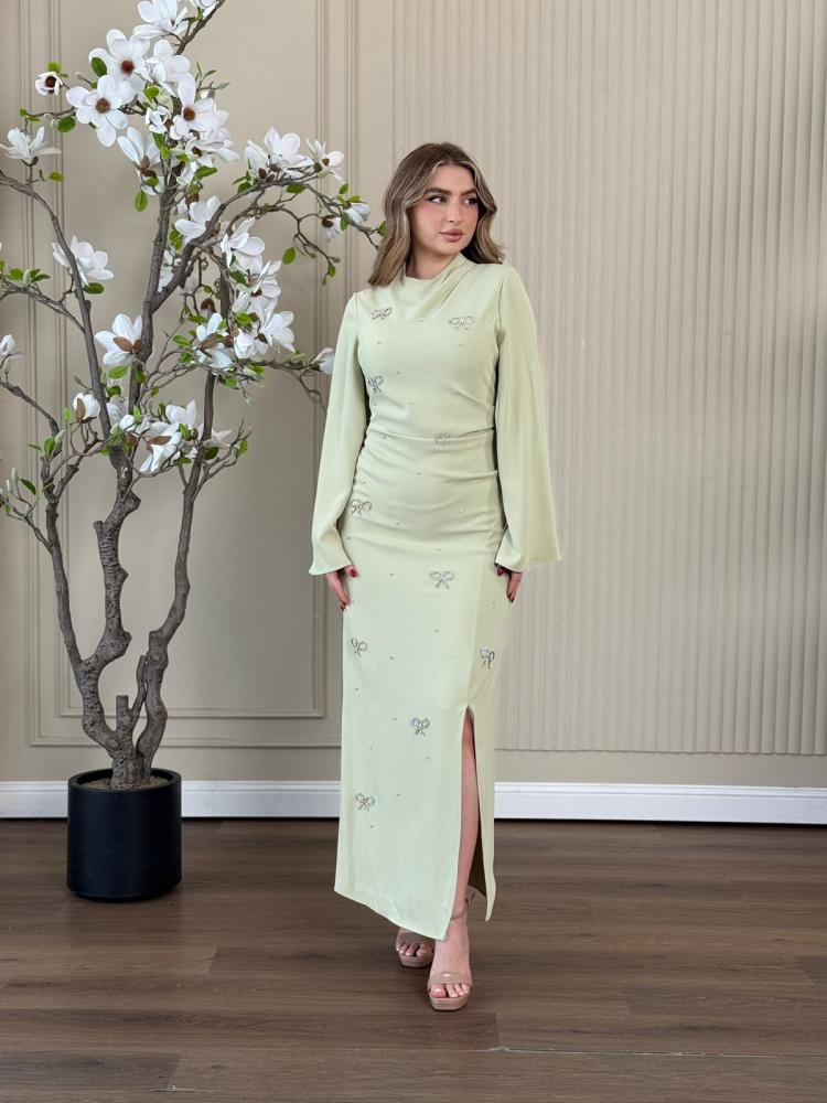 فستان أنيق بأكمام واسعة وتفاصيل ناعمة على شكل فيونكات