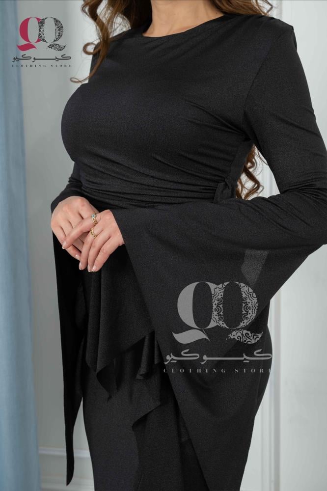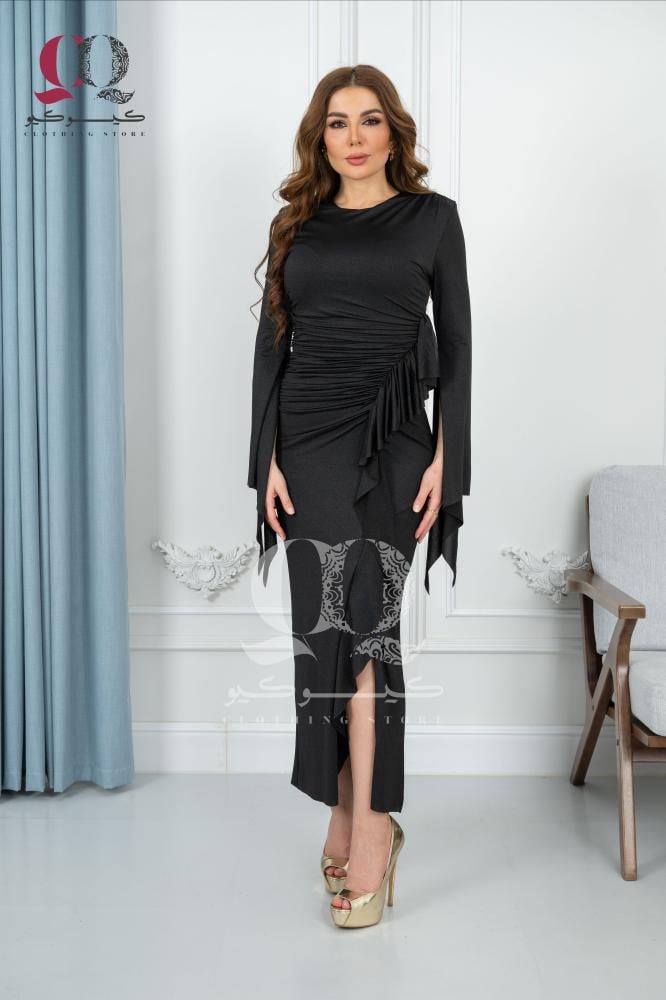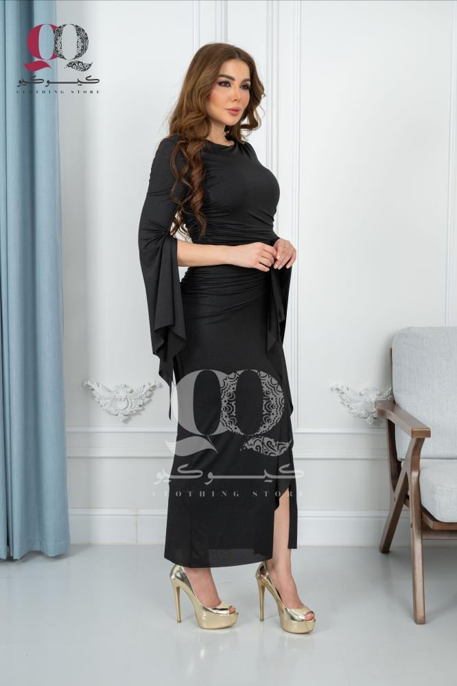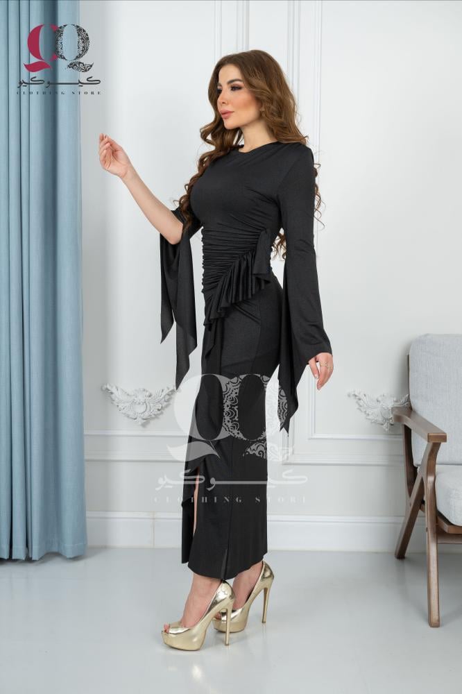 ألقي بإطلالة أنيقة مع فستان إليجانت نوار، الذي يجمع بين التصميم الراقي والجاذبية العصرية. مصنوع من قماش فاخر مطاطي ينساب على الجسم بنعومة ليبرز جمال القوام. يتميز بقصّة دراپيه أنيقة على الخصر تعزز من نحافة الخصر، مع أكمام طويلة بفتحات دراماتيكية تضفي لمسة ملكية فريدة.