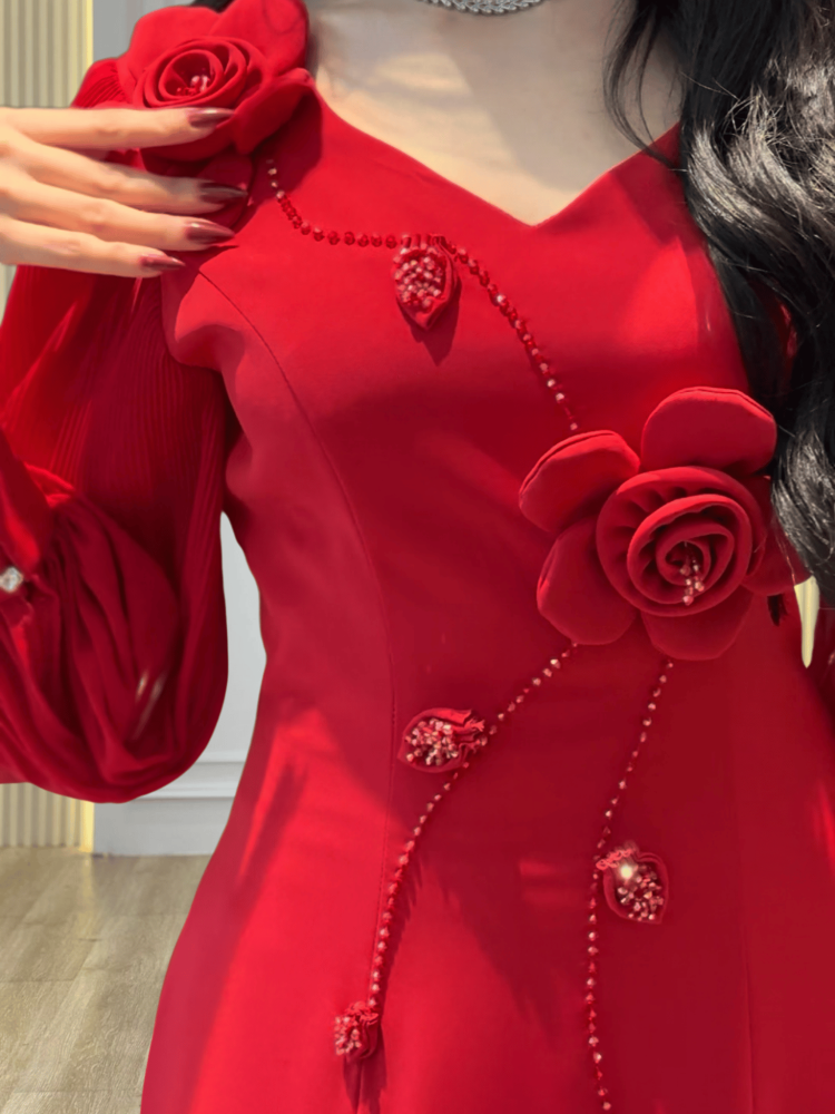 تألقي بإطلالة ناعمة وفاخرة مع فستان روزا إليجانس، المصمم خصيصًا ليبرز جمالك وأناقتك في المناسبات الخاصة ✨. يتميز بتفاصيل الورود ثلاثية الأبعاد على الصدر مع حبات اللؤلؤ الفاخرة التي تضفي لمسة من الرقي 🌟.