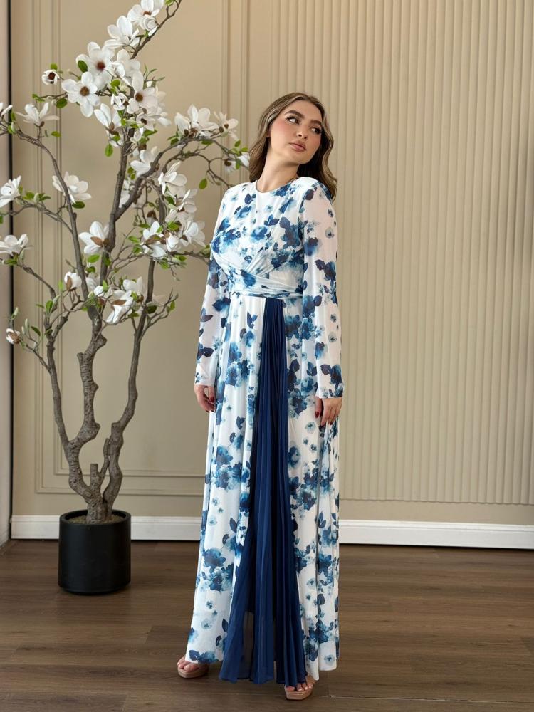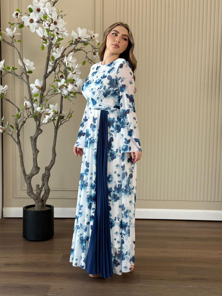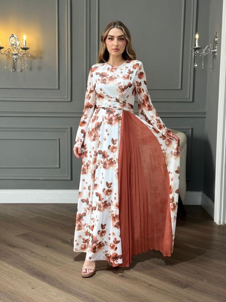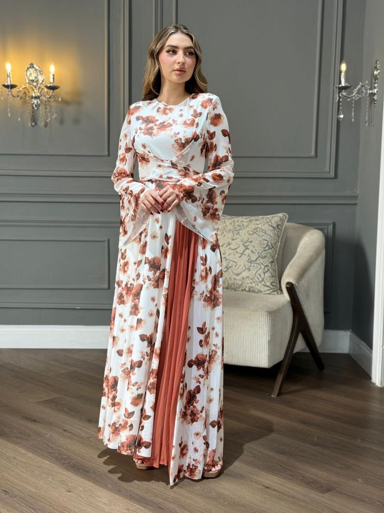 فستان بطبعات زهرية ناعمة وتصميم مميز بكسرات جانبية
