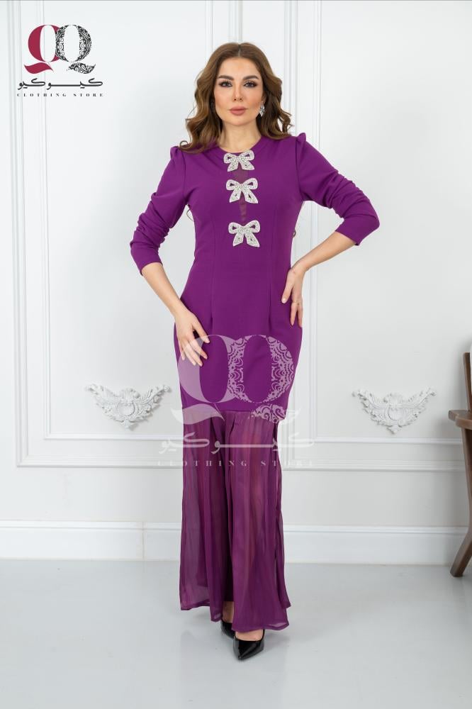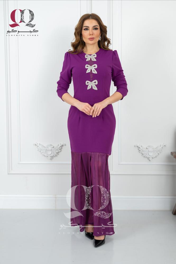 تألقي بإطلالة راقية مع هذا الفستان الفوشي الساحر المصمم بأناقة فائقة. يتميز الفستان بقصة أنثوية جذابة، مزينة بثلاث فيونكات مرصعة بالكريستال اللامع على الصدر لإضفاء لمسة فاخرة. الجزء السفلي مصنوع من قماش شفاف يمنحك مظهرًا أنيقًا وجذابًا. تصميمه الأنيق بأكمام طويلة وخامة فاخرة يجعله مثاليًا للسهرات والمناسبات الرسمية.