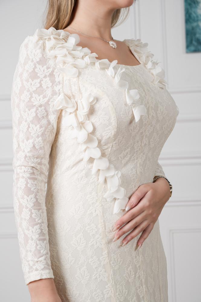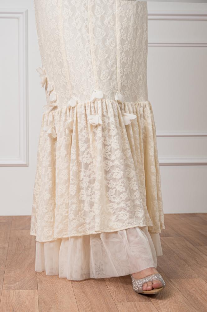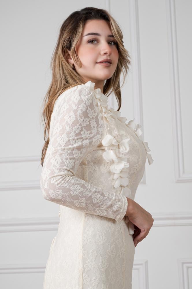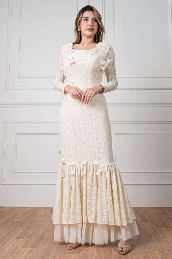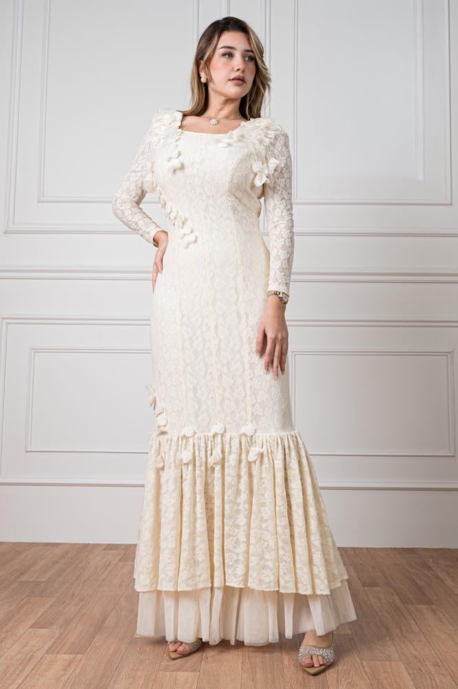 فستان لمسة الورد بتصميم أنثوي ناعم من الدانتيل الفاخر، مزدان بزهور ثلاثية الأبعاد على الكتف والصدر تمنحه لمسة شاعرية راقية. القصة الضيقة مع الكسرات السفلية تبرز القوام برقيّ، مما يجعله خيارك الأمثل للمناسبات الراقية واللحظات المميزة. 🌸