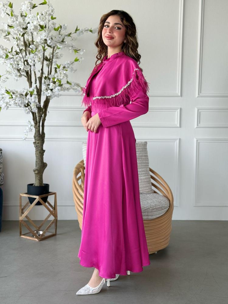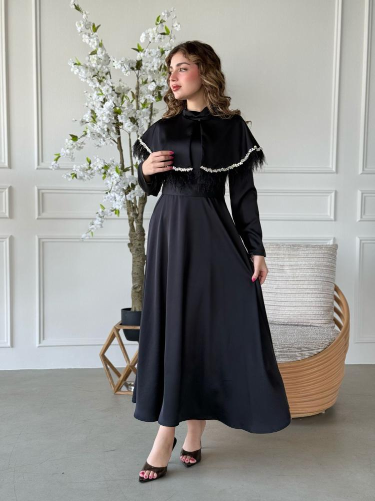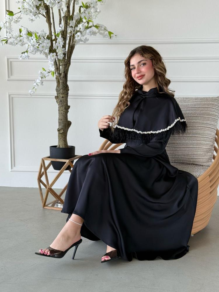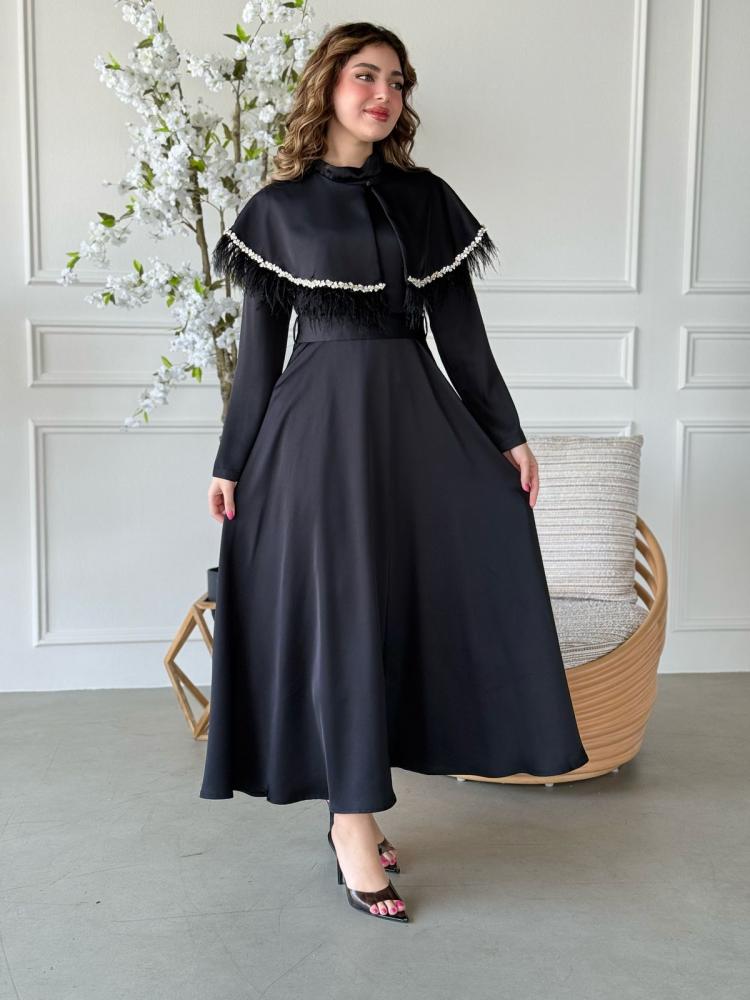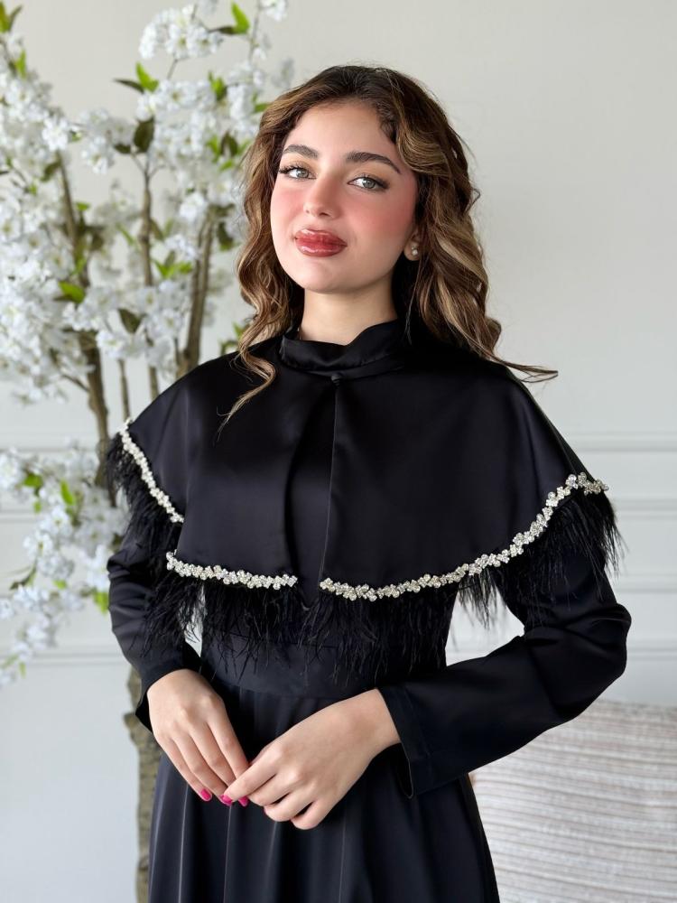 الياقة المرتفعة تمنحك أناقة ملكية، بينما التصميم المغلق يوازن بين الحشمة والفخامة، ليجعله الخيار الأمثل للسهرات، العيد، أو أي مناسبة رسمية تستحق إطلالة أيقونية.