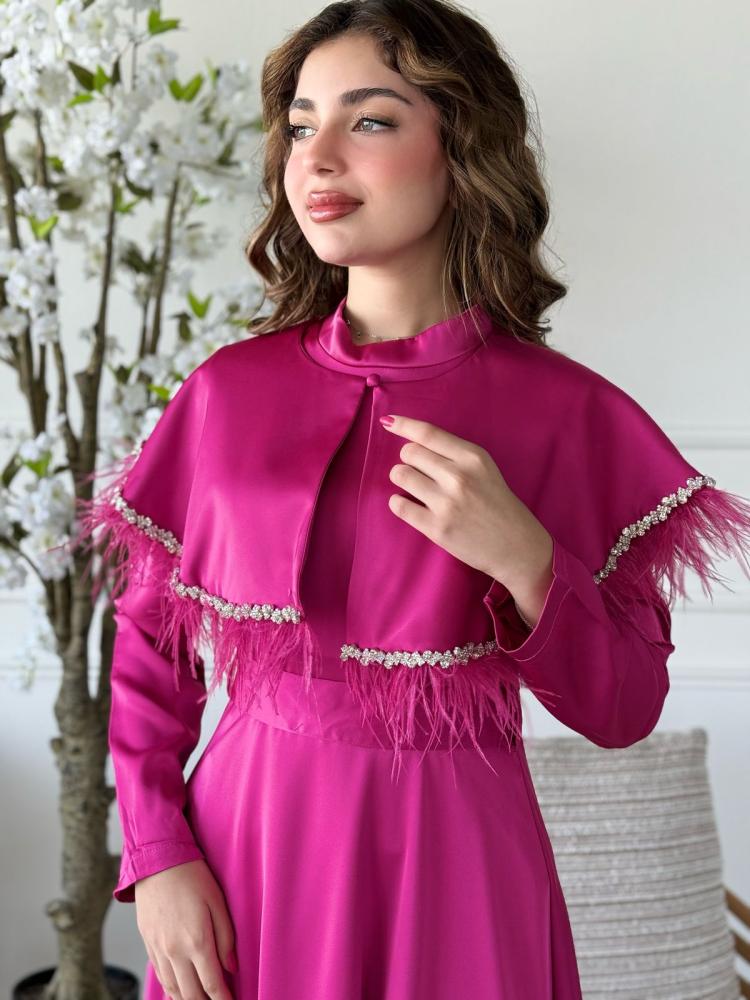 بتصميمه الفريد، يتألق فستان "لمسة الديفا" بكاب علوي مزين بـ ريش ناعم وتطريز لامع بالكريستال، يمنحك حضوراً آسرًا لا يُنسى. القماش الانسيابي ينساب بنعومة على القوام، فيما تضيف القصة المحددة عند الخصر لمسة أنثوية ساحرة.