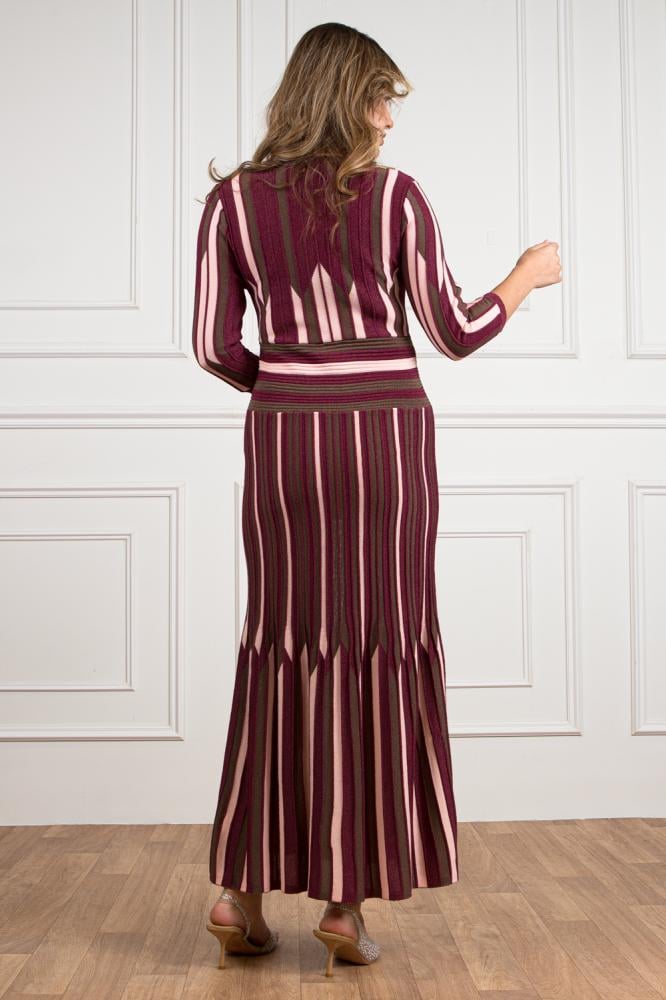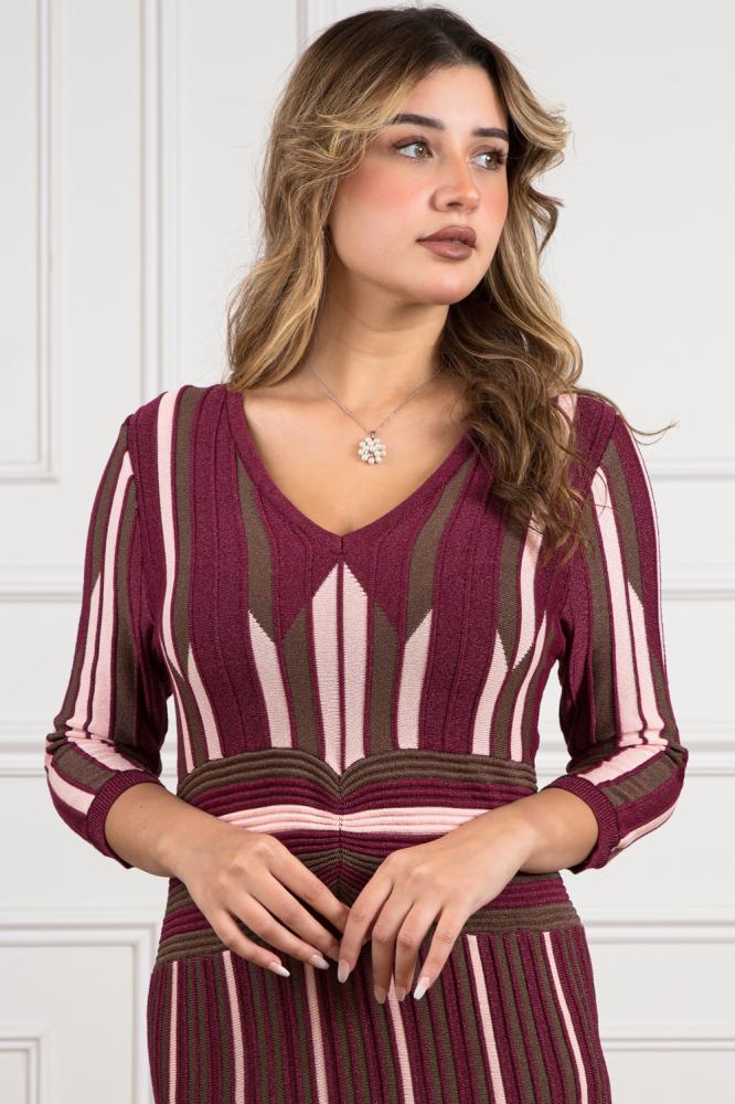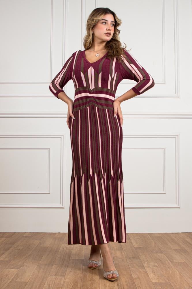 فستان طويل بخطوط عمودية تجمع بين البرغندي والوردي الزيتوني، تمنحه مظهرًا ممشوقًا يعزز من أنوثة القوام.