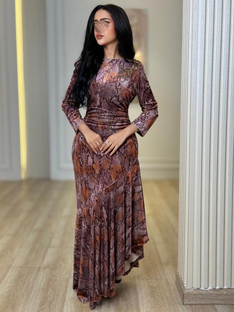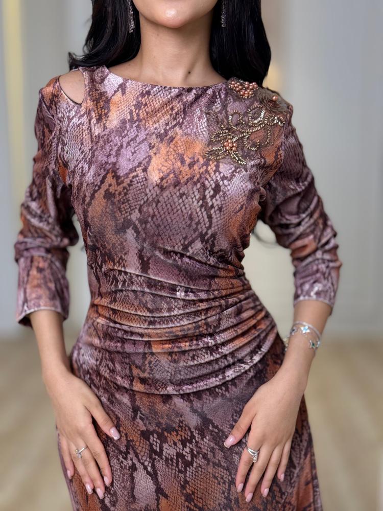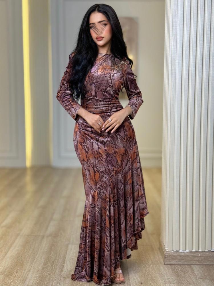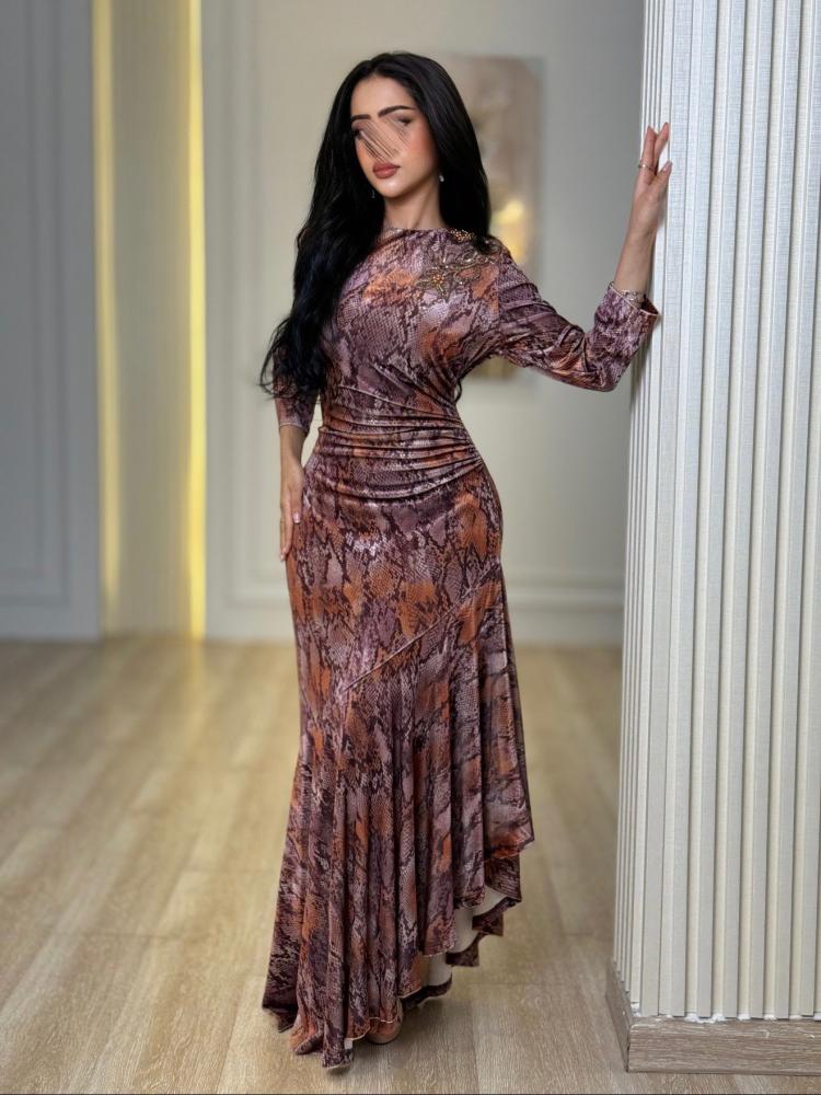 فستان بنقشة جلد الثعبان بدرجات ترابية دافئة، يجمع بين الجرأة والأنوثة في تصميم واحد. تفاصيل التطريز الفخم على الكتف تضيف لمسة ملكية، فيما ينساب القماش على الجسم بانسيابية تبرز القوام برقيّ لا مثيل له. اختيار مثالي لإطلالة جريئة وفاخرة في آنٍ واحد.