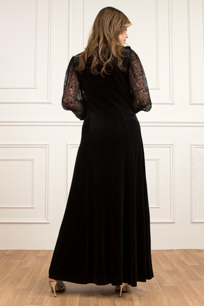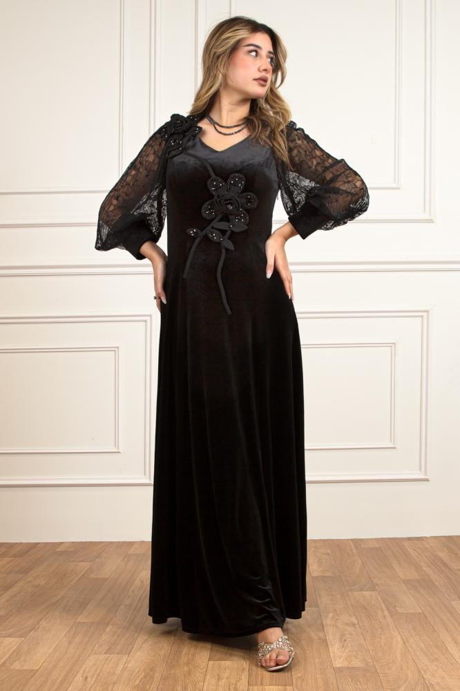 فستان مخمل أسود بأكمام دانتيل وزهور