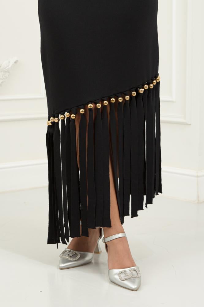 ✨ فستان أسود بتفاصيل ذهبية لامعة تضيف لمسة من الفخامة والرقي.